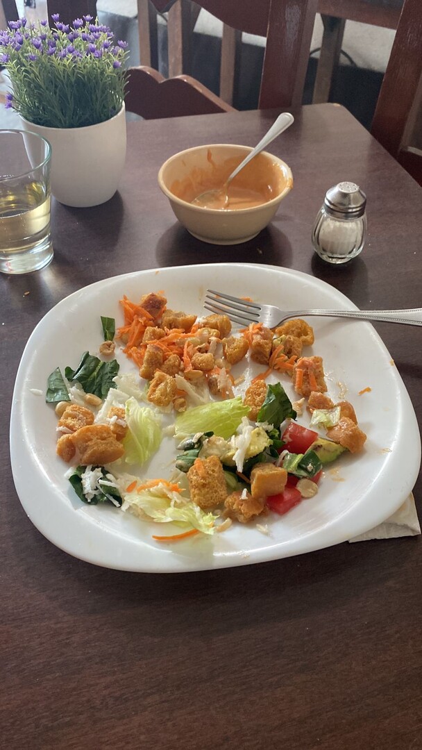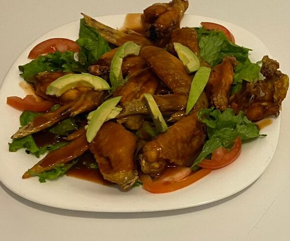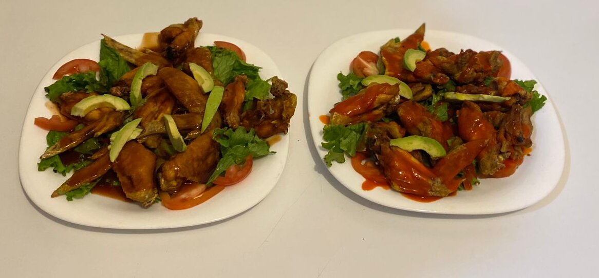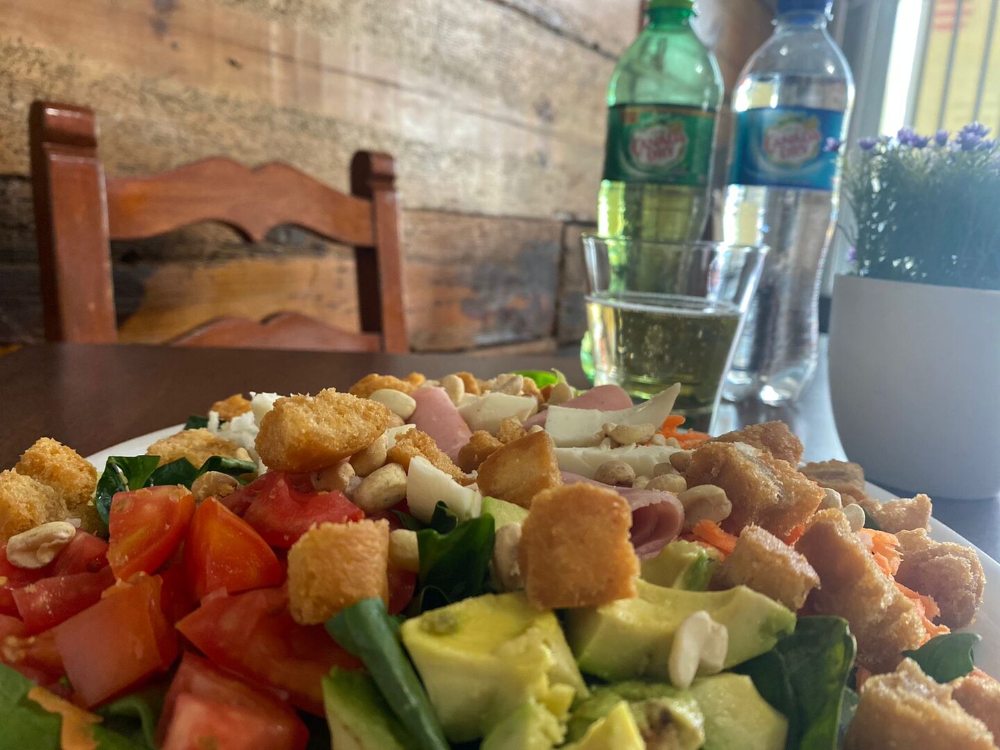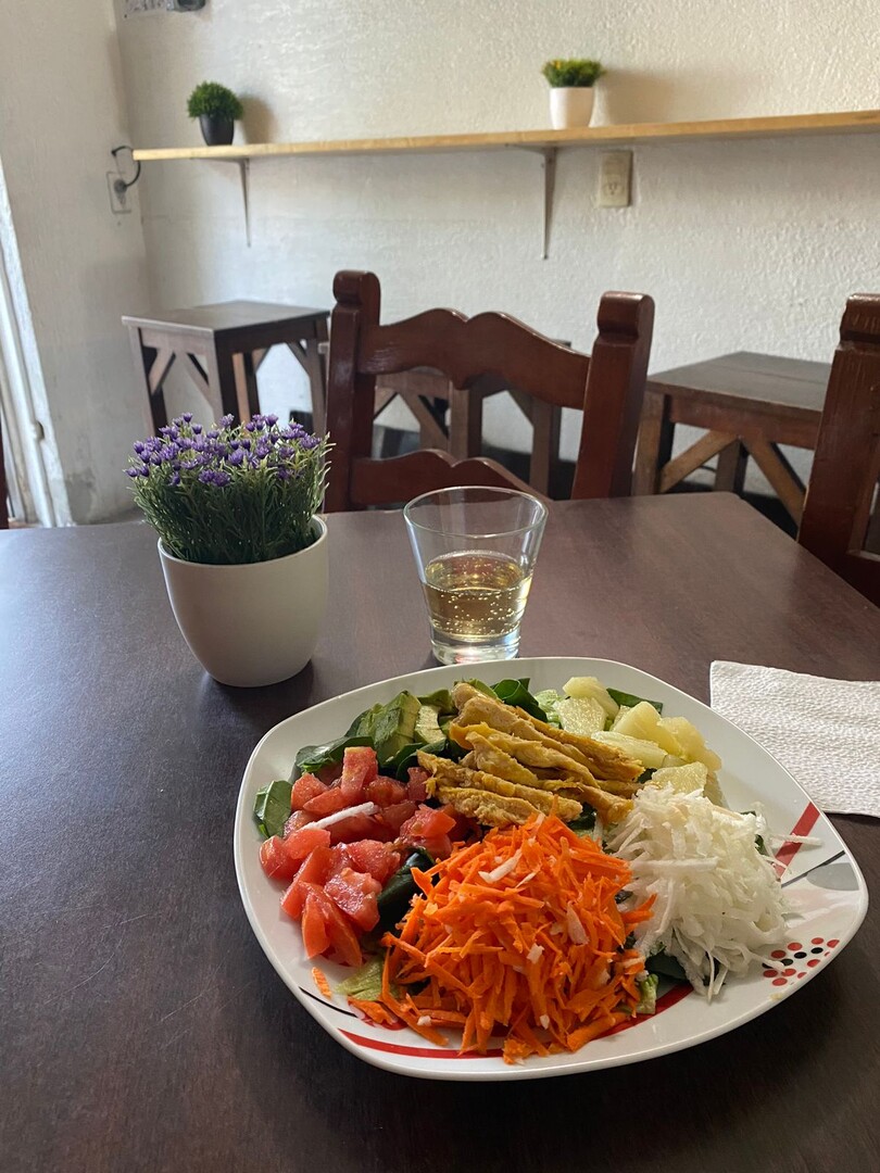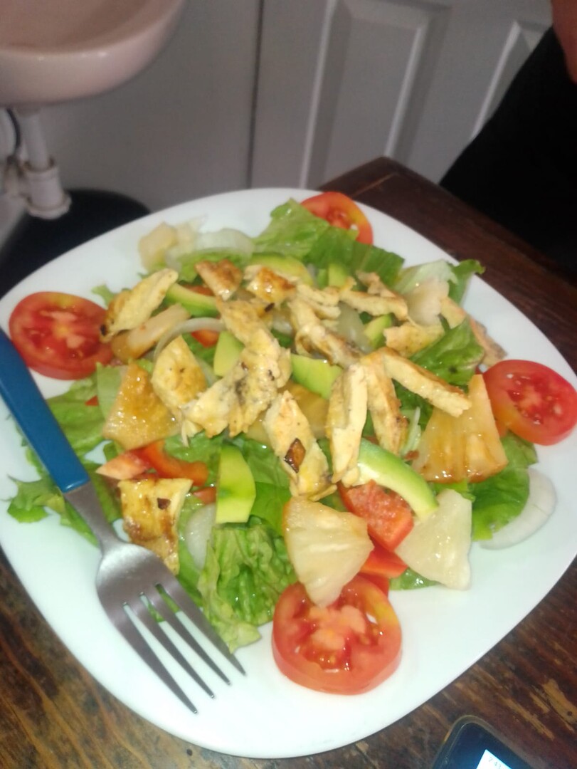 Ensalada de Pollo: lechuga-espinaca-pimiento-jicama-zanahoria-100gr de pollo $60