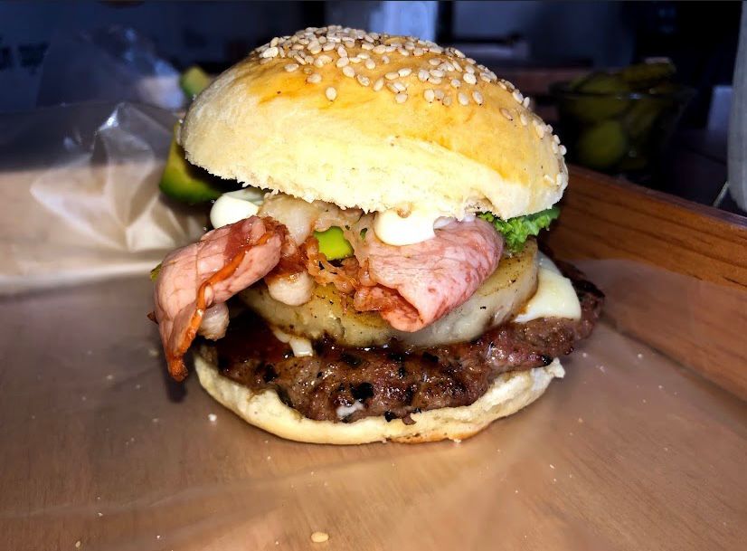 La Atascada: Doble carne-jamon-quesillo-jitomate-piña-tocino y aguacate $120