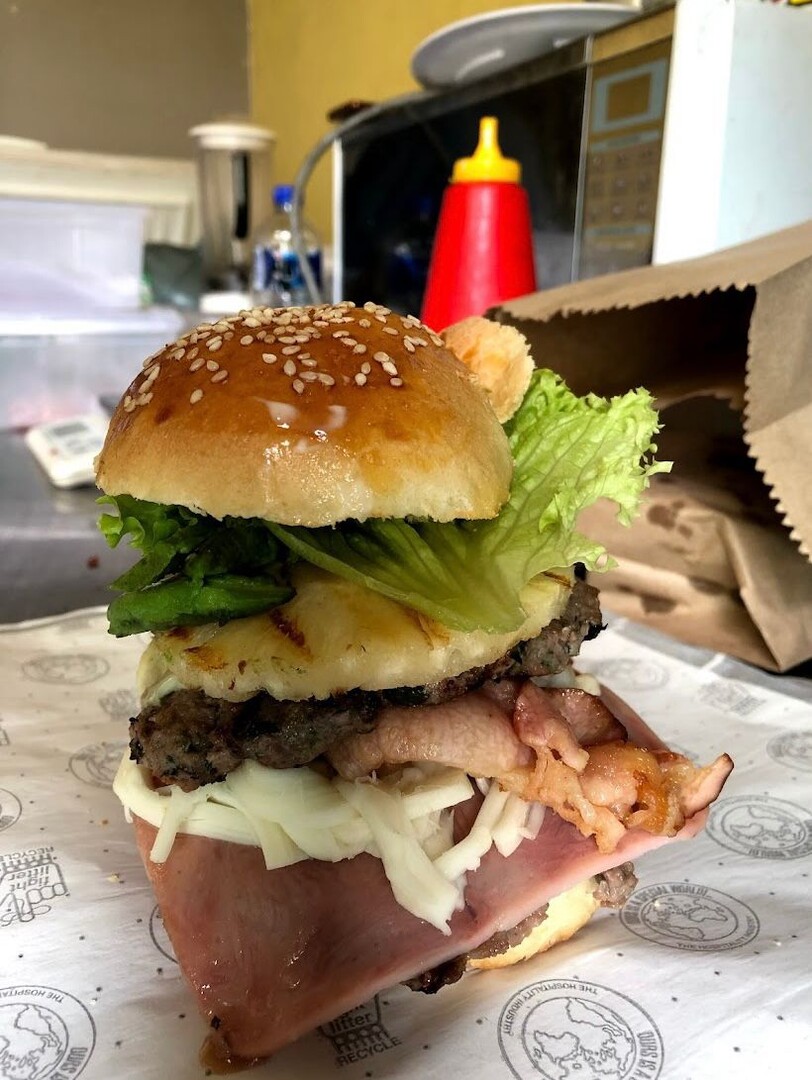 La Atascada Triple: Tres carnes-jamon-quesillo-jitomate-piña-tocino y aguacate $150